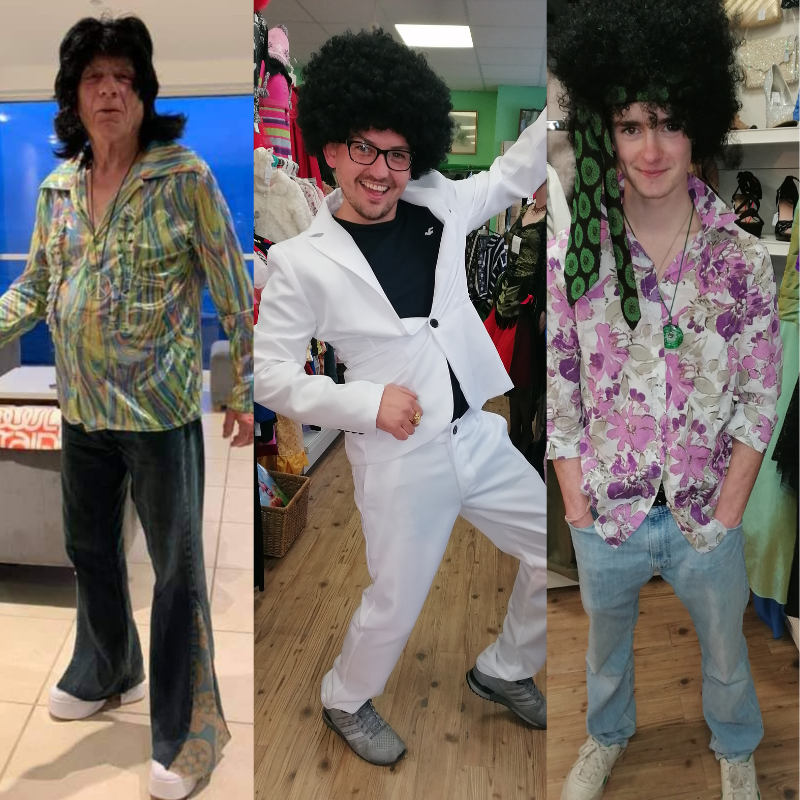 70's Disco Fever: Satin frilly shirts & flairs to groove in. Wigs & medallions available.