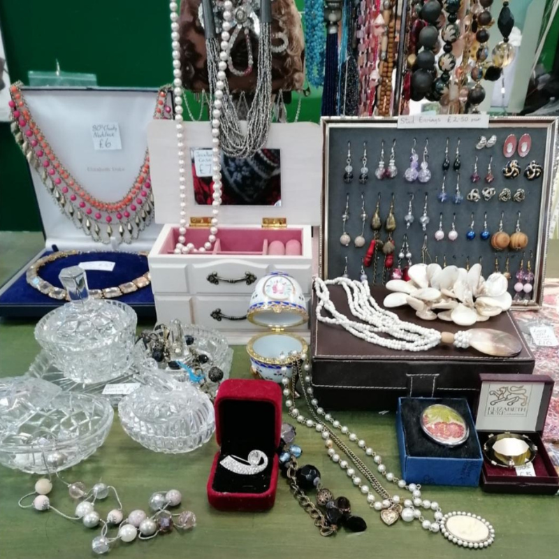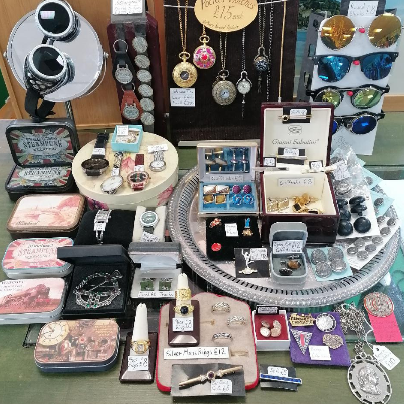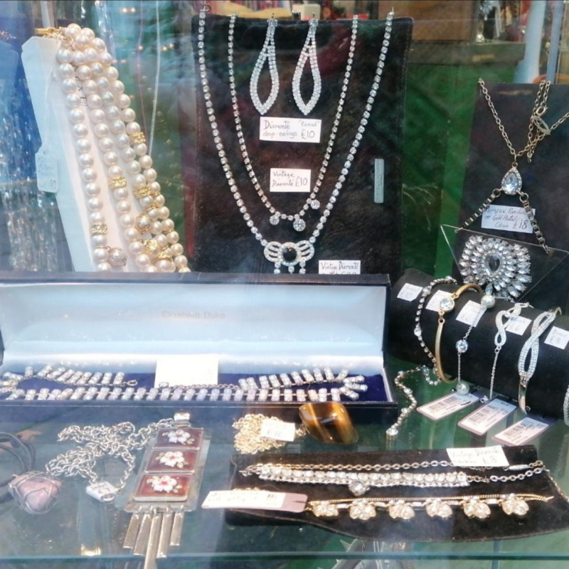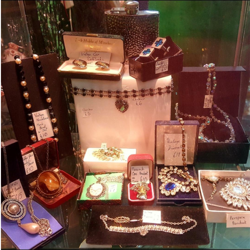 Vintage pearls, semi-precious, some silver, marcasite & crystal, but mostly costume jewellery from every decade. Tie pins, pocket watches & cufflinks for men.