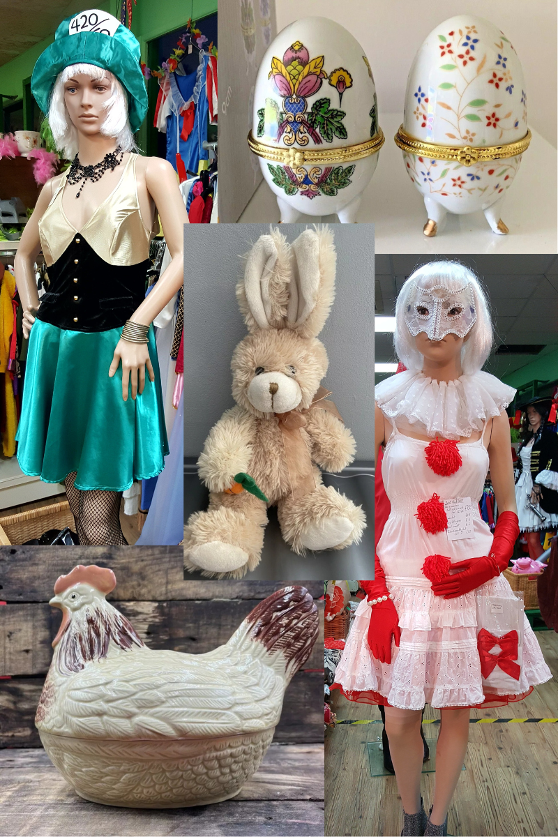 Easter time we have soft toys & some cute fancy dress outfits for kids. Adults might like the easter ceramic eggs, or other themed outfits.